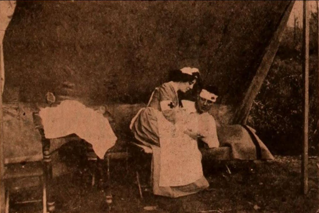 [Bearbeiten | Quelltext bearbeiten]Szene aus dem Film The Red Cross Heroine (1909)