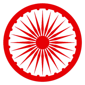 Da hier keine Darstellung des angedachten Roten Spinnrads bekannt ist, wird hier zur Veranschaulichung die Form des Carkhā (indisch चरखा), das sich auch in der Flagge Indiens findet, verwendet.